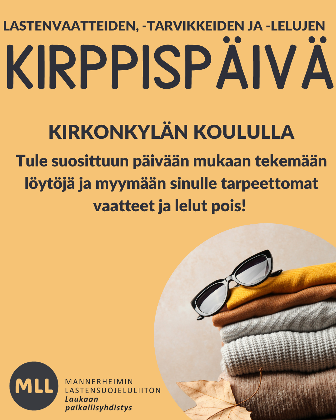 Syksyllä kirppistellään tutulla kaavalla Laukaan kirjonkylän koululla. Tapahtumassa voit tulla myymään ja ostamaan tarvittavat lastenvaatteet, - tarvikkeet ja -lelut syksyn ja talven tarpeisiin. Myyntipaikkoja on tarjolla n.50 kpl ja ilmoitamme lähempänä niiden varaamisohjeet!