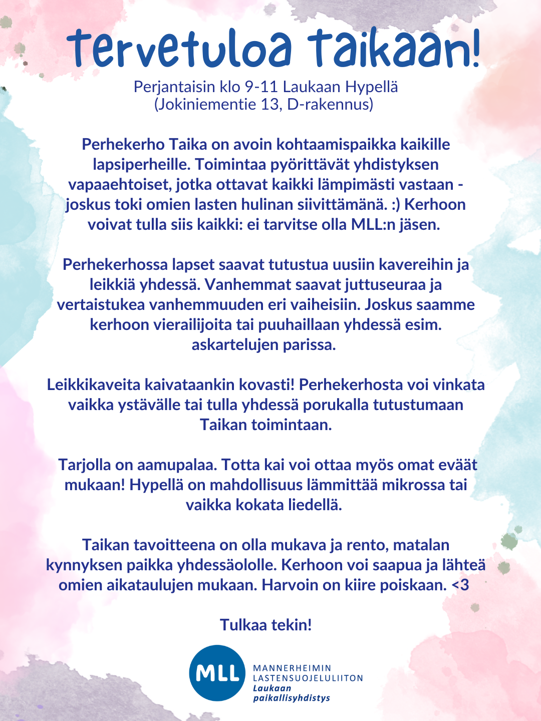 Perhekerho Taika perjantaisin klo 9.00-11.00 Laukaan Hypellä (Jokiniementie 13, D-rak.)